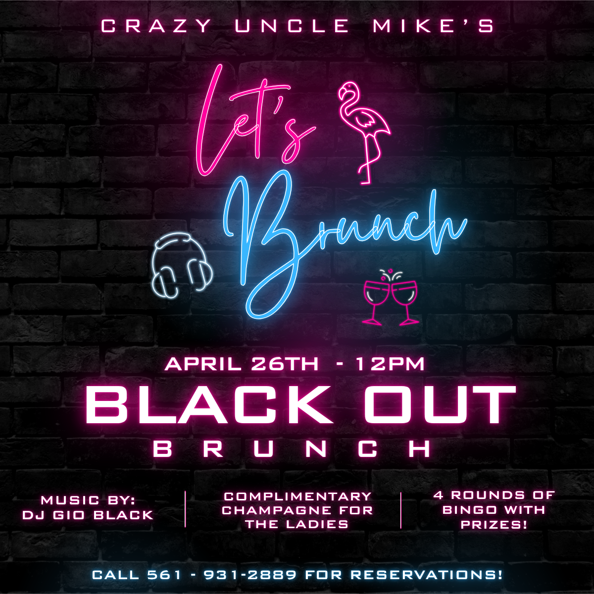 Join us for Black Out Bingo & Brunch at Crazy Uncle Mike’s tomorrow, March 29th, at 12PM! We’re blacking out all the windows and turning up the party with 4 FREE rounds of musical bingo with prizes every round, complimentary champagne for the ladies, and all your favorite Pop & EDM hits spun by DJ Gio Black! Don’t miss the best brunch in Boca! Call 561-931-2889 for reservation today!